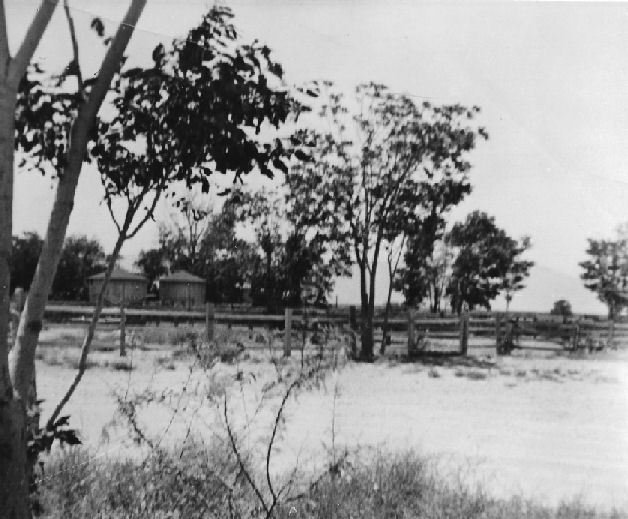 Subject: The corral on the Pahrump Ranch, about 1950. Two large grain bins are visible in the distance. Behind the corral there was a pasture.