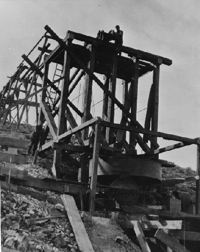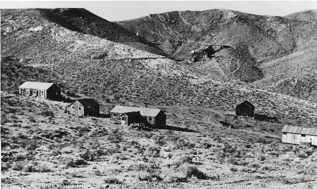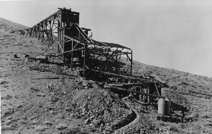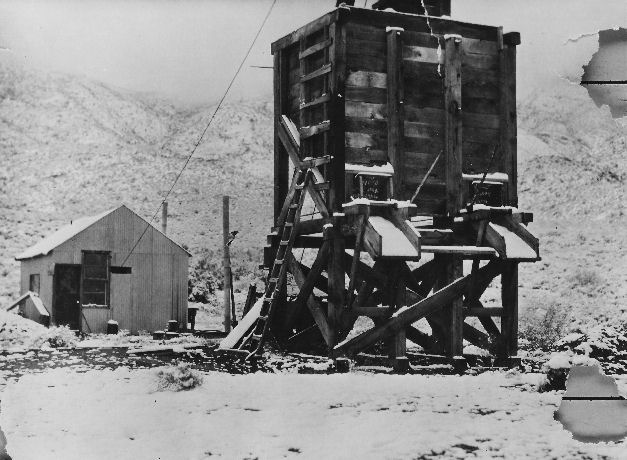 Subject: Surface structures at the Crowell fluorspar mine, located in the Bare Mountains east of Beatty, Nevada; photo taken in 1939 or