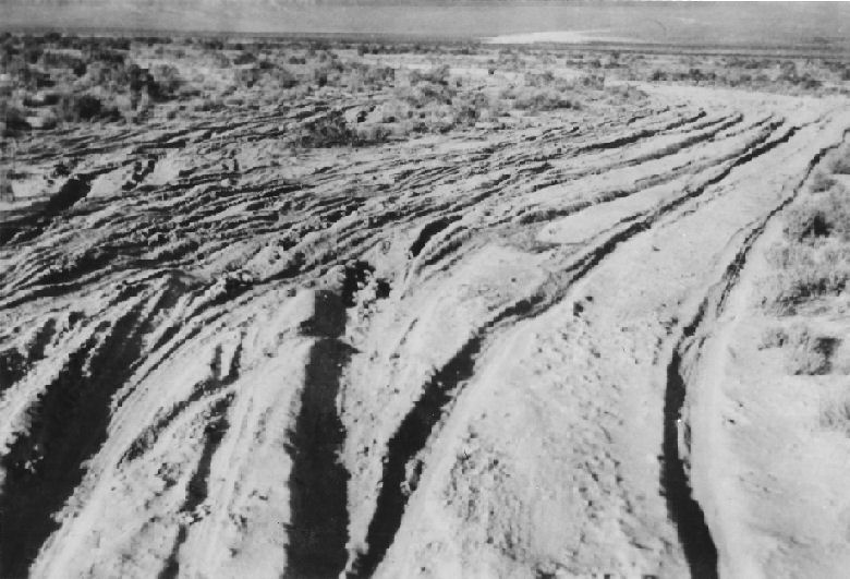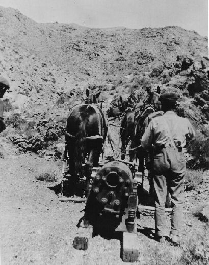 Funeral Mountains, west of Beatty, Nevada, probably about 1914. This photograph illustrates the difficulty in moving equipment in the