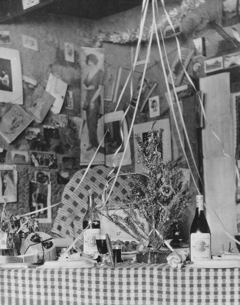 Subject: Christmastime in the dugout dwelling occupied by Joshua Irving Crowell at his Chloride Cliff mine, located in the Funeral