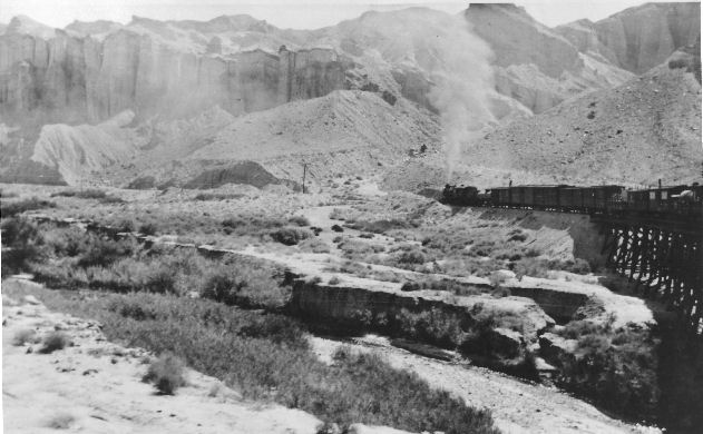 Subject: - Tonopah and Tidewater Railroad as it crossed the Amargosa River about 8 to 10 miles from Tecopa, California, around 1915.