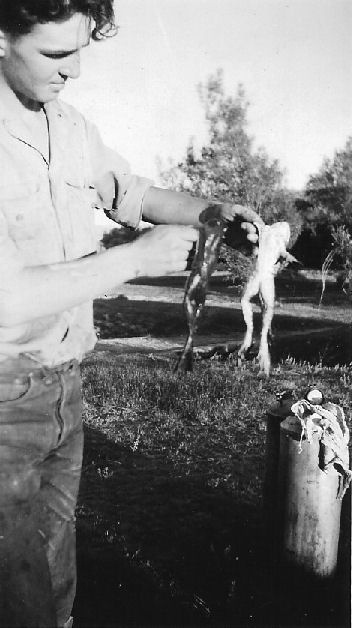 holding a giant Jumbo frog grown in ponds at the Joe Clifford Ranch. - July 9, 1944 - C. E. B.
