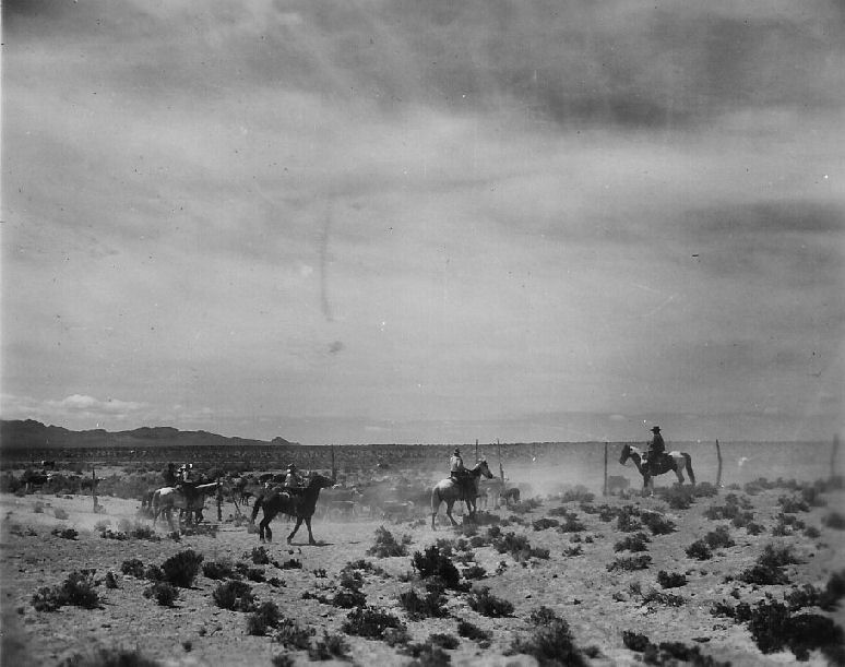 Subject: Joe Clifford Ranch - Stone Cabin Valley - Riders trailing in a herd of range cattle and placing them in a holding field preparatory to parting
