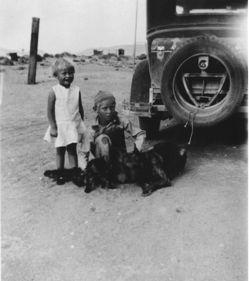 Subject: Jepperson children, Louise and Tom, residents of Ash Meadows, Nevada, ca. 1933. "Seems like I heard Tom was a World War II hero.